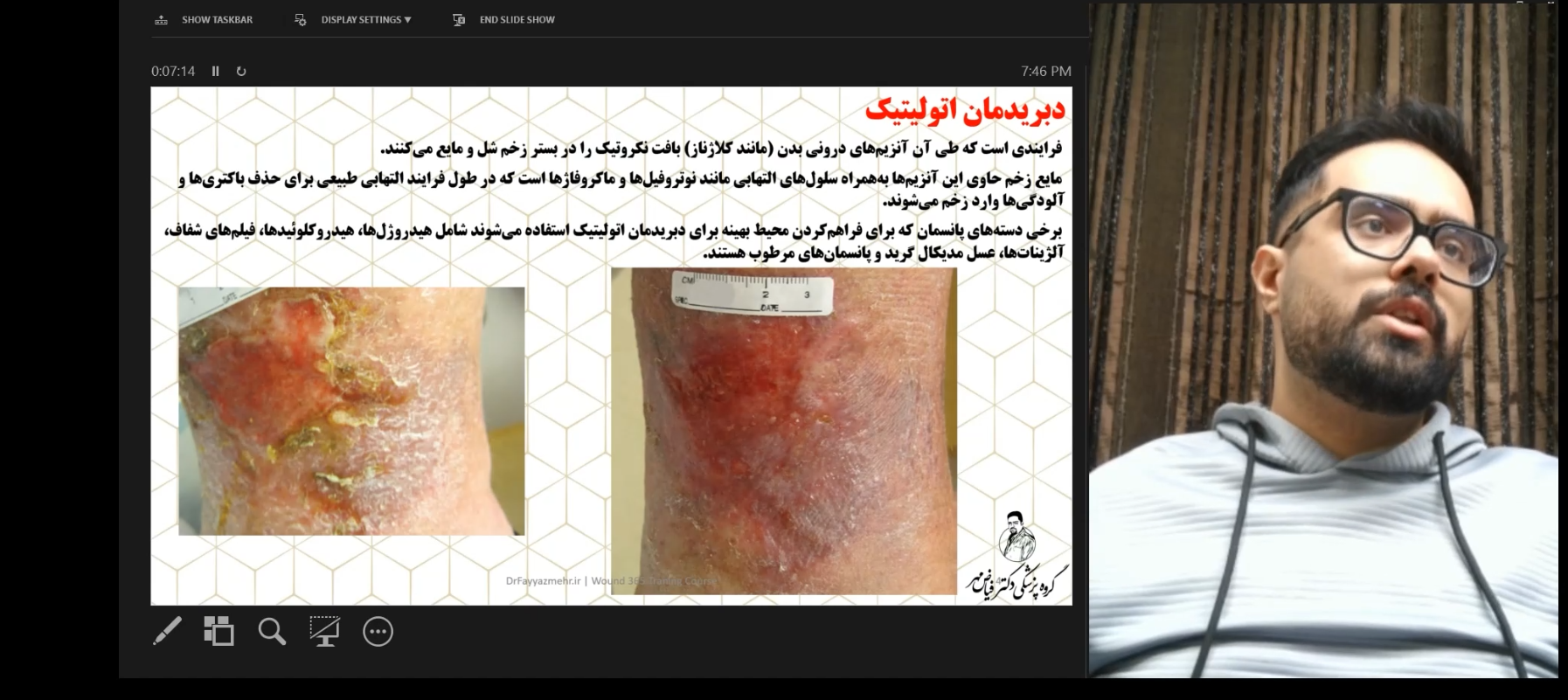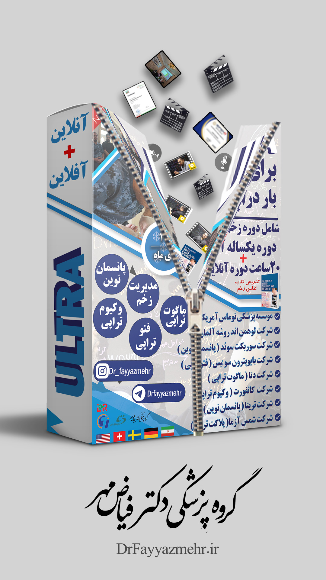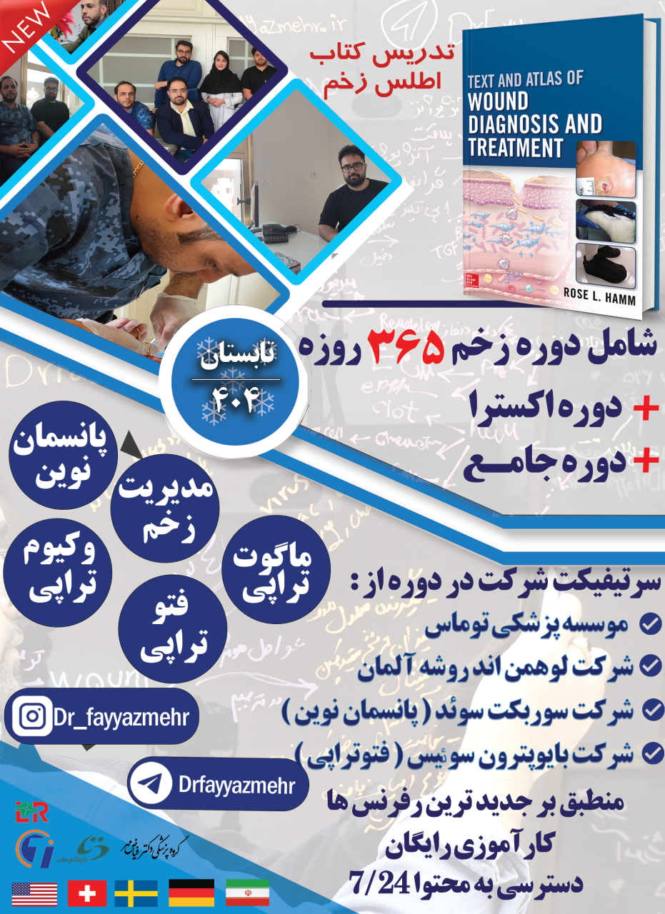 سرفصل های دوره جامع:chapter1 - skin anatomy & physiology chapter 2,healing response chapter 3, vascular wound's chapter4, pressure wound chapter 5, diabetic foot ulcer chapter 6, burn wound chapter 7, Lymphedema Chapter 8, Atypical Wound chapter 9 - Factors That Impede Wound Healing chapter 10 - Evaluation of the Patient with a Wound chapter 11 - Wound Debridement chapter 12 - wound dressing Ch13- Theoretical training of wound dressing, Ch 14-Clinical and practical training of wound dressing Ch 15- Light therapy Ch 16-Theoretical Of PRP Ch 17-practical Of PRP Ch18 - Theoretical training of vacuum therapy Ch 19- Clinical and practical training of vacuum therapyCh 20- Theoretical of Maggot therapy Ch 21- Clinical and practical training of maggot therapy Ch 22- Clinical and practical training of Debridment